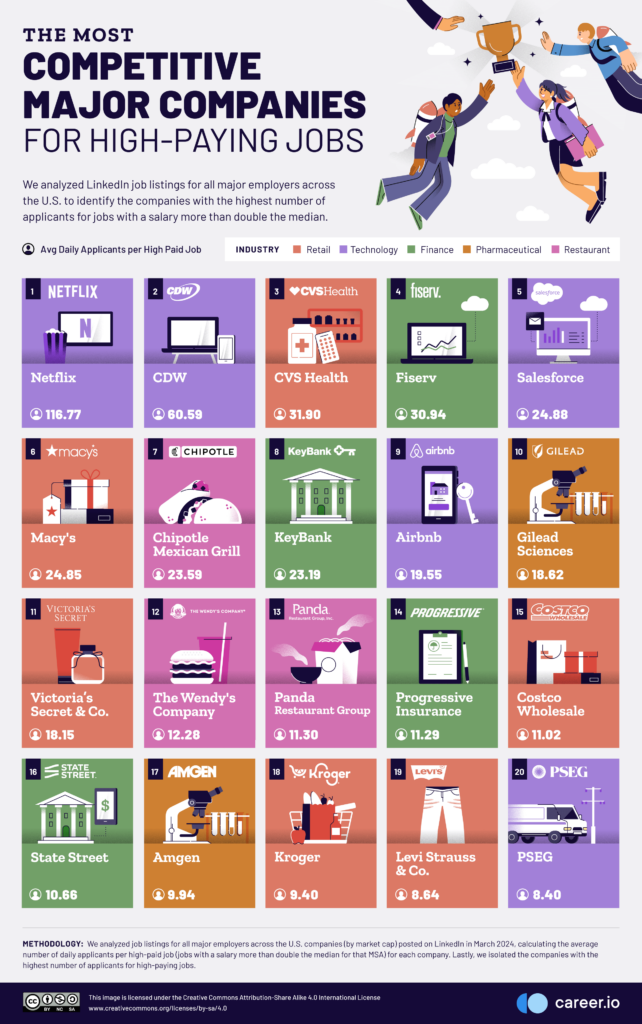 Following their guide to the least competitive regions for highly paid jobs in America, Career.io now presents their ranking of the employers currently offering high-paying roles that receive the most and fewest applicants to help you land the job you’ve been looking for.