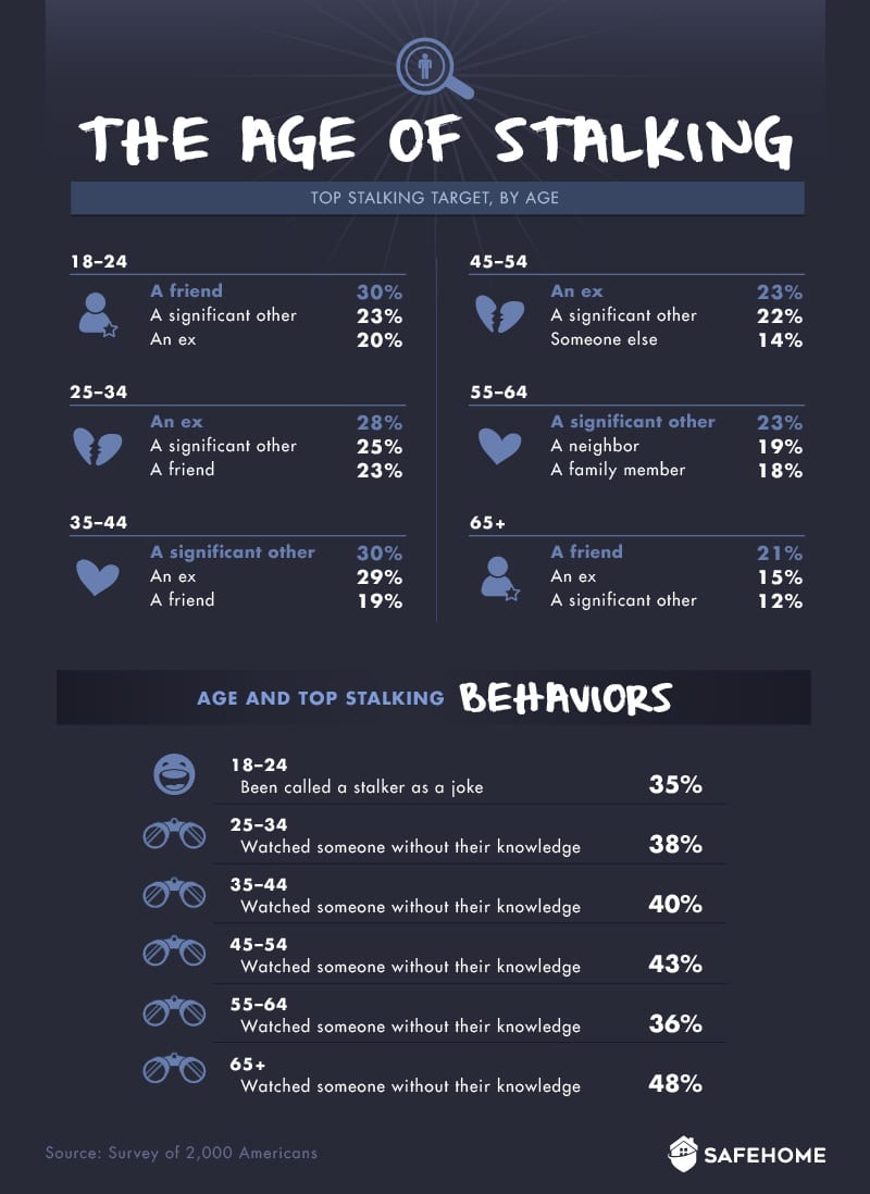 SafeHome broke down stalking targets by age. The youngest group they surveyed (aged 18 – 24 years old) said they stalked their friends more than any other group. Non-romantic friendships are more important to college-aged adults as they strive to find their place in the wider community. This factor could explain why friendship groups are common targets of stalkerish behavior within this age demographic.