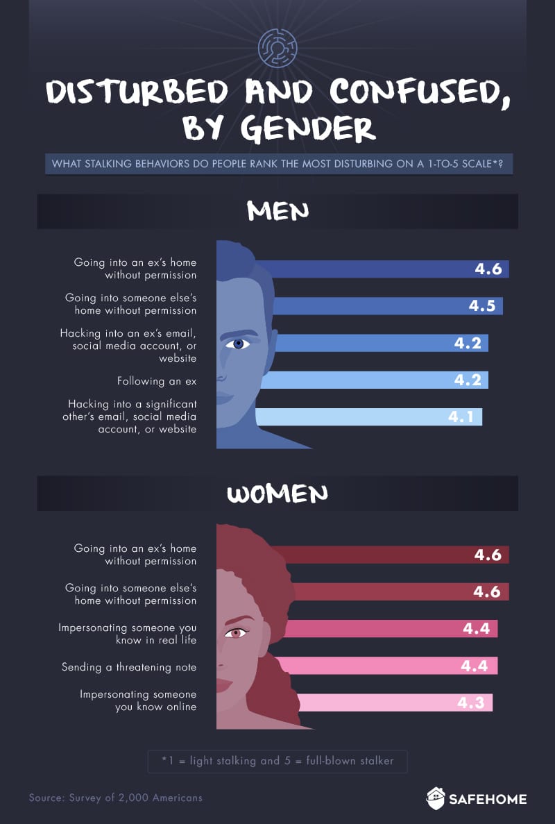 Meanwhile, impersonating someone in real life—or online—disturbed women more than men. Whereas both sexes equally agreed that going into an ex’s house without permission was definitely on the spooky-scale.