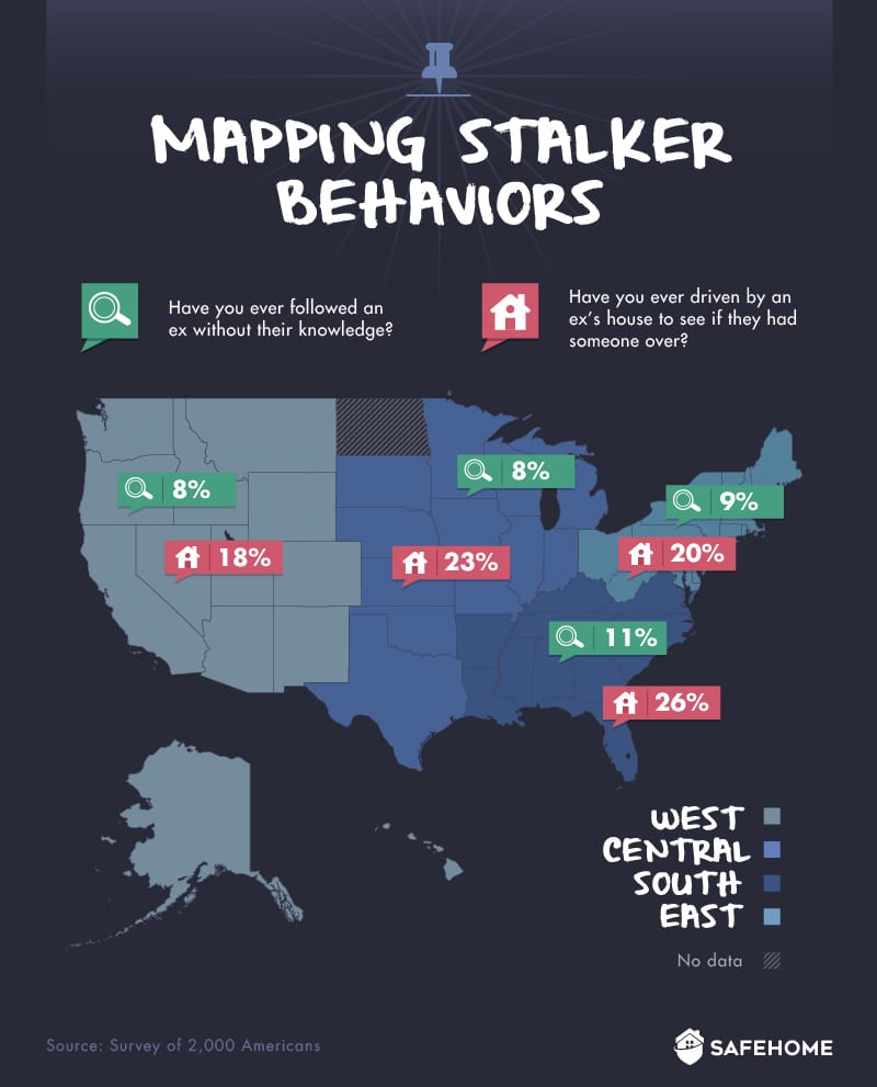 Those living in the West were the least likely to obsessively pursue their exes by following them or driving by their homes, while those living in the South were the most likely to do so. East Central U.S. fell in the middle.