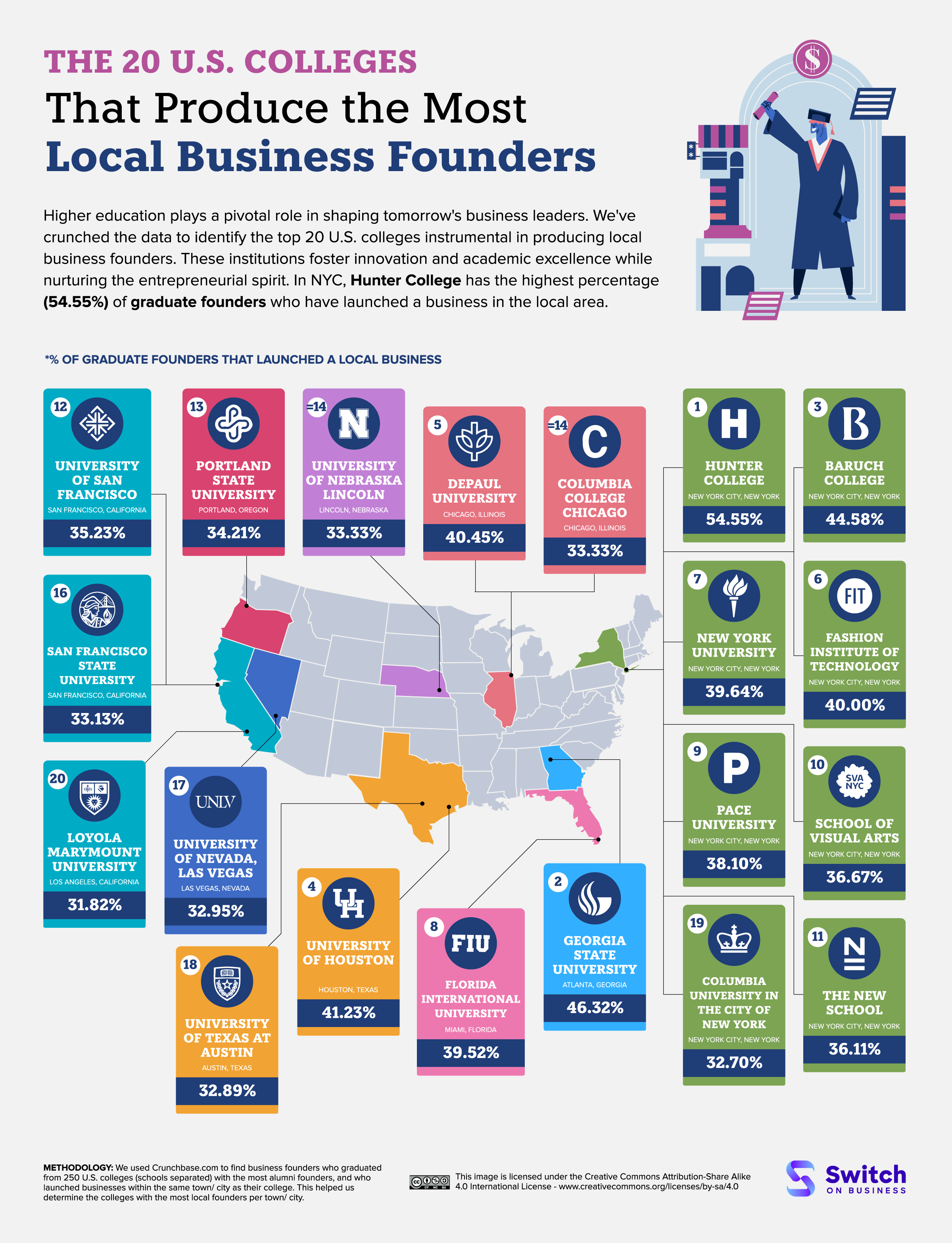 To find out, the Switch On Business team used Crunchbase and LinkedIn data to find business founders who graduated from 250 colleges (schools separated) with the most alumni founders to reveal the U.S. colleges that see the most business founder graduates launch companies within their college’s city or state: https://switchonbusiness.com/where-founders-launch/