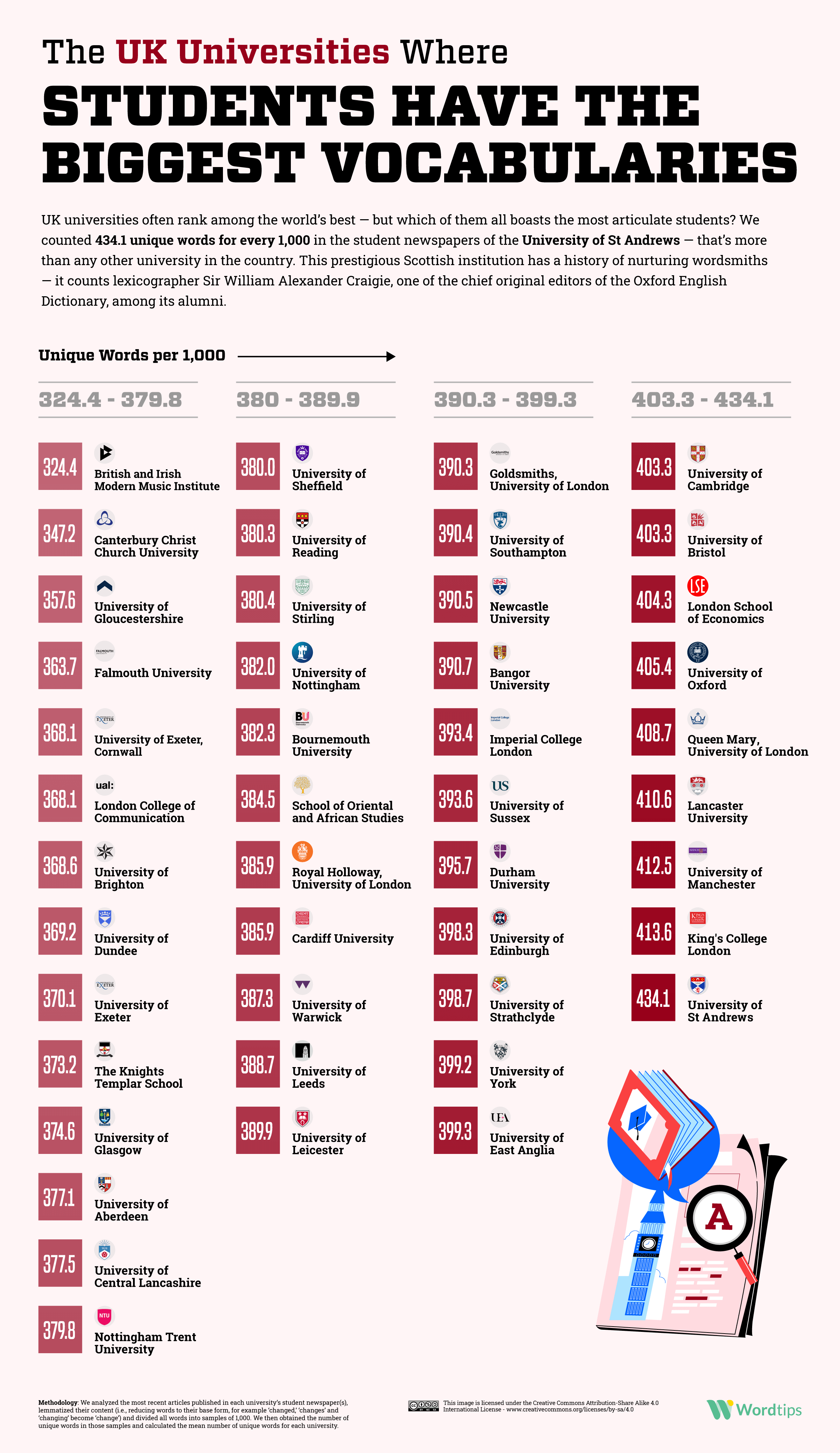 To find out which students have the biggest vocabularies, WordTips looked at student newspapers across universities from the U.S., UK, Canada and Australia. They analyzed the most recent articles published by each publication, grouped the newspapers into universities, lemmatized their content and then divided all words into samples of 1,000. Finally, they obtained the number of unique words in those samples and calculated the mean number of unique words for each college.